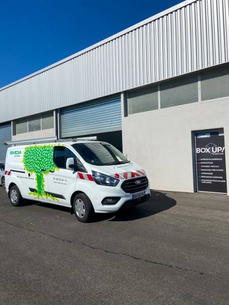 Pour ces deux Ford Transit, un mélange d'impression numérique pour le logo (l'arbre) et de la découpe de lettres pour le reste des infos présentent sur les véhicules. Le mélange de ses deux procédés est un incontournable pour le marquage de véhicule. Et nous le proposons souvent à nos clients pour économiser du vinyle en impression numérique. Quand c'est important pour nos clients, on y prête une attention particulière.